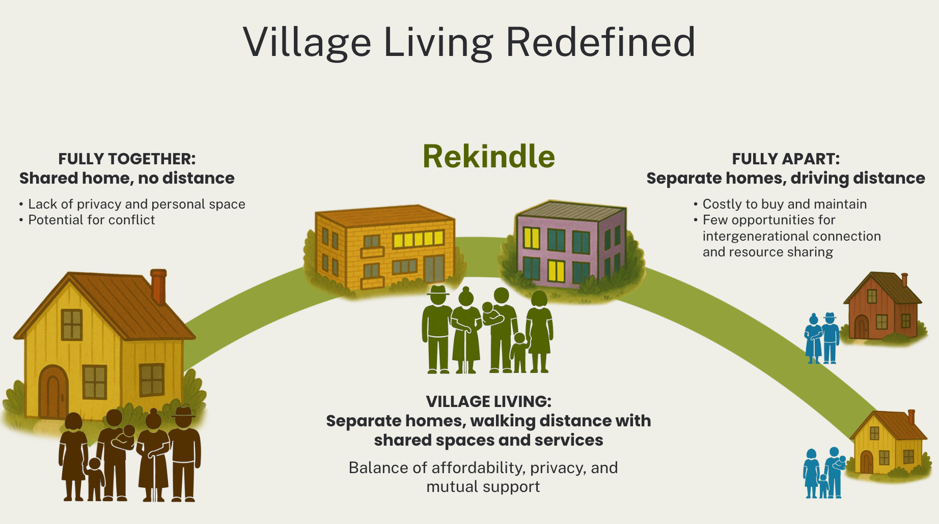 Rekindle is a new venture to mainstream multigenerational housing in America. We’re in the process of designing a village-scale community that will offer multi-roof solutions for multigenerational families within an intentionally planned, walkable campus. Shared amenities like co-working, lifelong learning, dining, health and wellness services, a garden and other recreation areas will bring the generations together for meaningful community building. Overall, the community will strike a balance between affordability, privacy and mutual support that cannot be achieved by living fully together or fully apart.